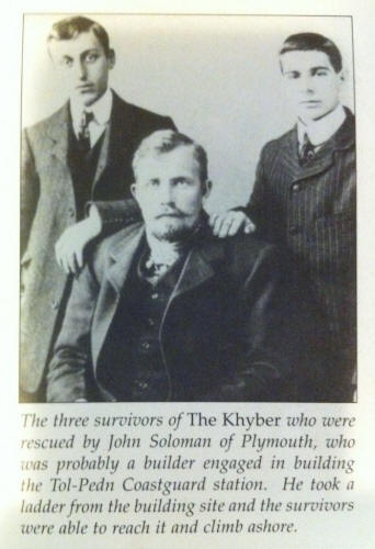 Survivors A picture from 'The Book of St Leven' found at Prothcurno Telegraph Museum. My great grandfather is on the right, L Harris on the left and Gun Johnson in the middle. For some time previously the crew had been in the rigging, it had been impossible to stay on deck with the tremendous see running. When the masts fell all but three were swallowed up by the seething waves and were drowned. Just before this however John Willis had jumped overboard and with the aid of floating wreckage succeeded in reaching the shore where fortunately he was subsequently found. He was still living, though it required nearly half an hour's artificial respiration to bring him round. Photo of L Harris L Harris, 18 from Victoria Australia and Gun Johnson, a Swede, in the meantime, had clambered over the vessel's side and gained a rock thirty feet away from the cliff where they were momentarily safe, though, as the tide was rising they were in imminent danger. They were rescued by quick thinking locals who used a ladder and some rope from a nearby construction site. The rope was thrown to the men which was fastened to the end of a ladder. The ladder was lowered to the rock and then made fast at the top of the cliffs. The angle was such that Harris and Johnson had to crawl almost flat along and over the intervening space to reach safety with the waves crashing a foot or so below them. Both men by this time were terribly exhausted and Johnson had received severe injuries to his head and leg but to the intense relief of the anxious spectators each man accomplished the passage safely. Harris said that a small steamer has passed them during the night without noticing their distress signals. The three survivors were taken every care of and later proceeded to Penzance.
